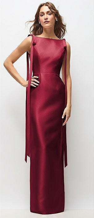 Bateau Neck Satin Column Maxi Dress with Exaggerated Tail Bow Straps in burgundy