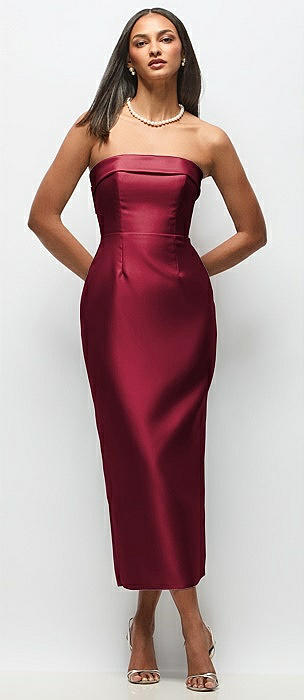 Strapless Cuff Satin Midi Dress with Column Skirt & Back Bow in burgundy