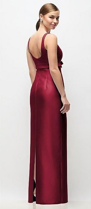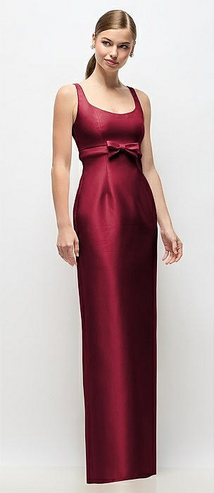 Scoop Neck Satin Column Maxi Dress with Bow at Empire Waist in burgundy