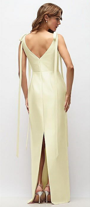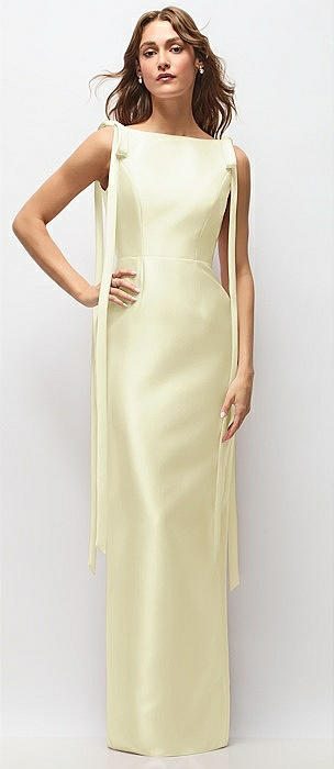 Bateau Neck Satin Column Maxi Dress with Exaggerated Tail Bow Straps in butter yellow