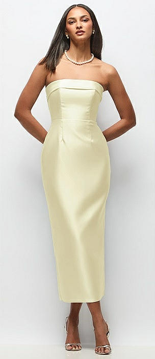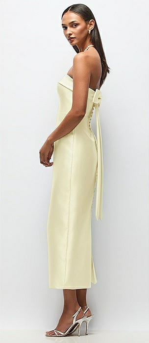 Strapless Cuff Satin Midi Dress with Column Skirt & Back Bow in butter yellow