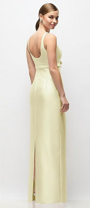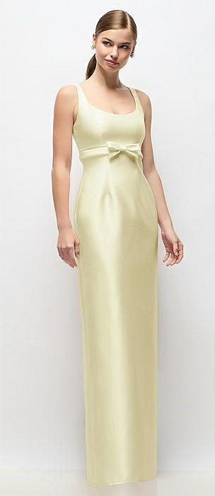 Scoop Neck Satin Column Maxi Dress with Bow at Empire Waist in butter yellow