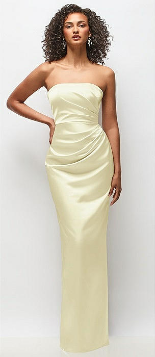 Strapless Draped Bodice Stretch Satin Column Maxi Dress in butter yellow