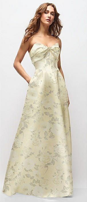 Strapless Cuff Floral Satin Maxi Dress with Column Skirt & Back Bow in butter yellow floral