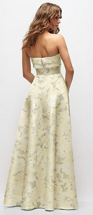 Strapless Hand-Pleated Bodice Floral Satin Maxi Dress with Full Pleated Skirt in butter yellow floral