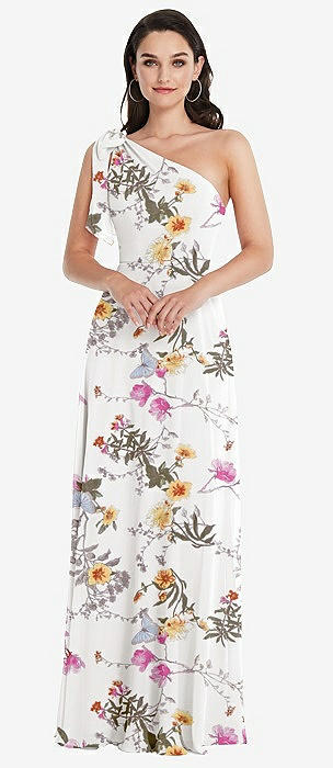 Draped One-Shoulder Maxi Dress with Scarf Bow in butterfly botanica ivory