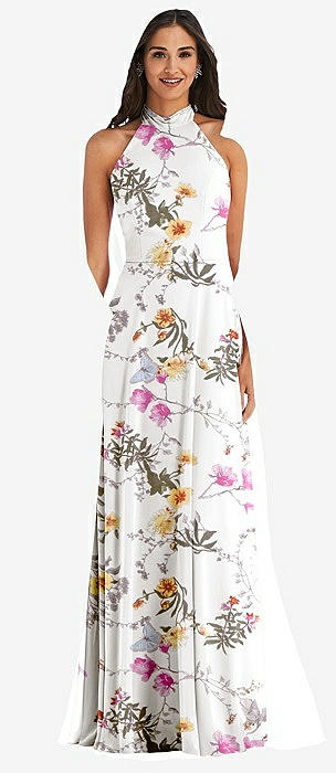 Shirred Skirt Jewel Neck Halter Dress with Front Slit in butterfly botanica ivory