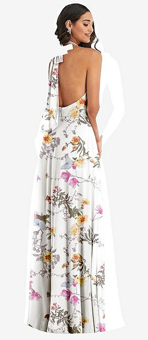 High Neck Halter Backless Maxi Dress in butterfly botanica ivory