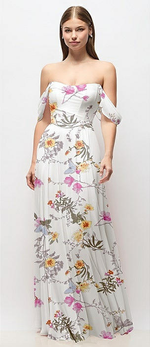 Off-the-Shoulder Basque Corset Floral Chiffon Maxi Dress in butterfly botanica ivory
