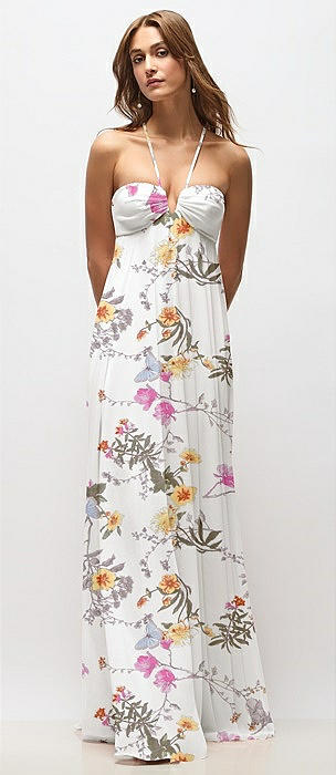 Empire Waist Floral Chiffon Halter Maxi Dress with Convertible Spaghetti Straps in butterfly botanica ivory