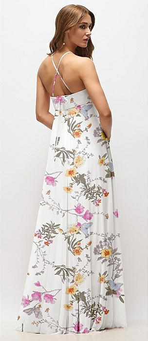 High-Neck Halter Floral Chiffon Maxi Dress with Adjustable Spaghetti Straps in butterfly botanica ivory