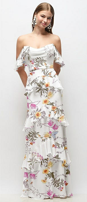 Off-the-Shoulder Cowl Floral Chiffon Tiered Ruffle Maxi Dress with Convertible Ruffle Straps in butterfly botanica ivory