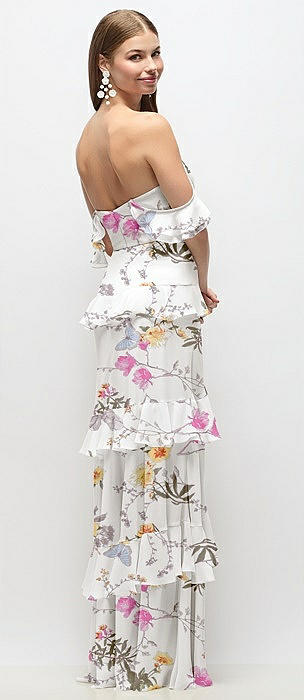 Bustier-Style Chiffon Tiered Ruffle Maxi Dress with Adjustable Straps in butterfly botanica ivory