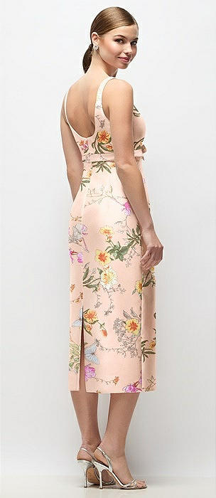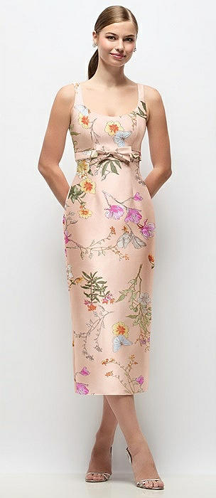 Scoop Neck Floral Satin Column Midi Dress with Bow at Empire Waist in butterfly botanica pink sand