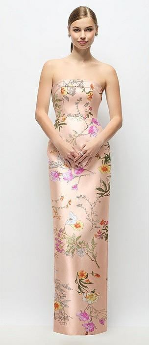 Strapless Floral Satin Column Dress with Back Slit in butterfly botanica pink sand