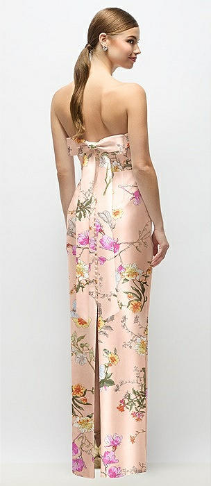 Strapless Cuff Floral Satin Maxi Dress with Column Skirt & Back Bow in butterfly botanica pink sand