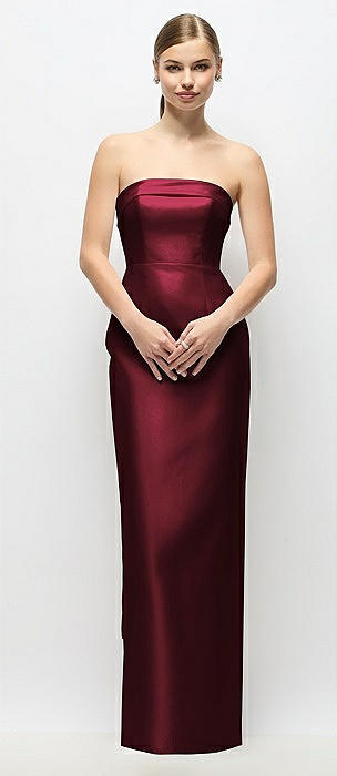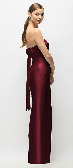 Strapless Cuff Satin Maxi Dress with Column Skirt & Back Bow in cabernet
