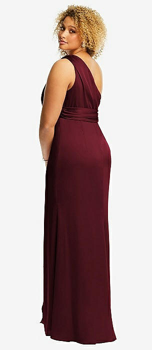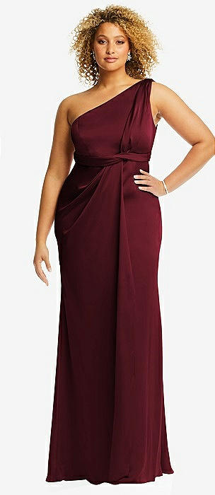 One-Shoulder Draped Twist Empire Waist Trumpet Gown in cabernet