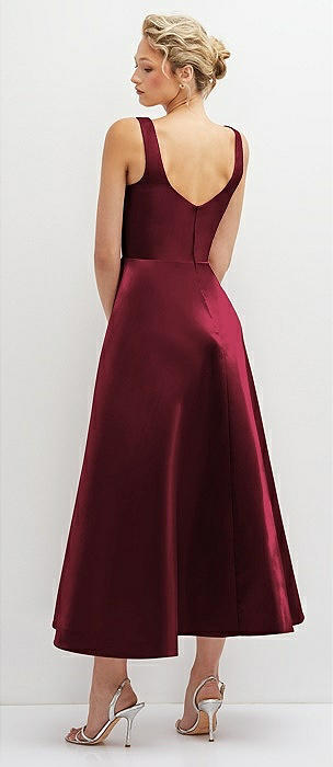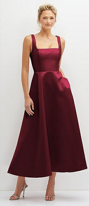 Square Neck Satin Midi Dress with Full Skirt & Pockets in cabernet