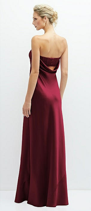 Strapless Topstitched Corset Satin Maxi Dress with Draped Column Skirt in cabernet
