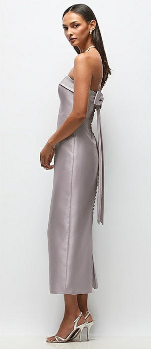 Strapless Cuff Satin Midi Dress with Column Skirt & Back Bow in cashmere gray