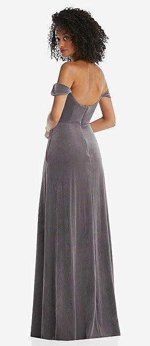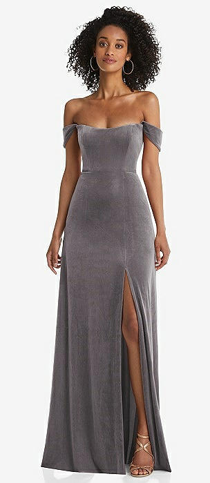 Off-the-Shoulder Flounce Sleeve Velvet Maxi Dress in caviar gray