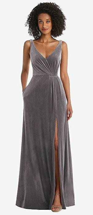 Draped Skirt Faux Wrap Velvet Maxi Dress in caviar gray