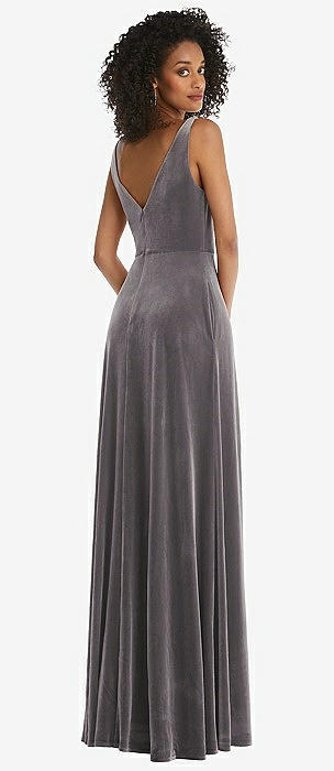 High-Neck Cap Shoulder Pleated Bodice Velvet Column Maxi Dress in caviar gray