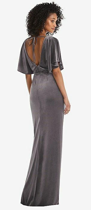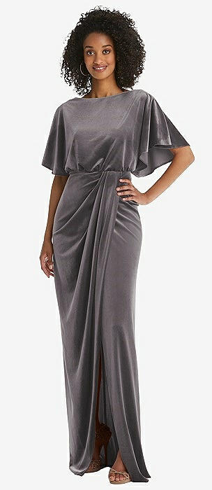 Off-the-Shoulder Flounce Sleeve Velvet Maxi Dress in caviar gray
