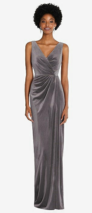 Draped Skirt Faux Wrap Velvet Maxi Dress in caviar gray
