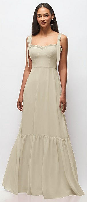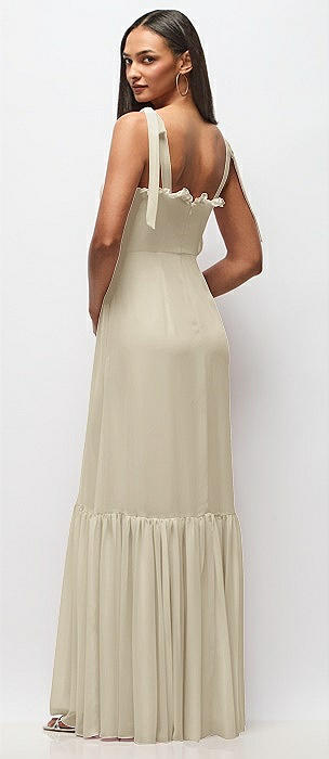 Tie-Shoulder Bustier Bodice Ruffle-Hem Maxi Dress in champagne