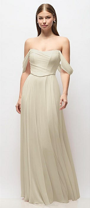 Off-the-Shoulder Basque Corset Chiffon Maxi Dress in champagne