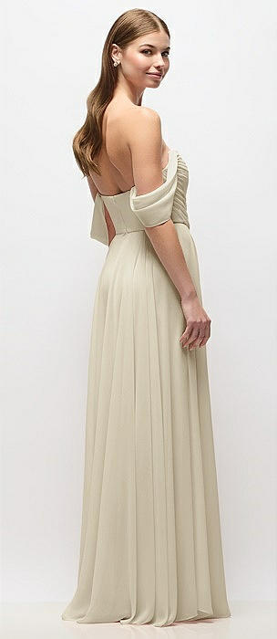 Strapless Chiffon Maxi Dress with Asymmetrical Ruched Drop Waist in champagne