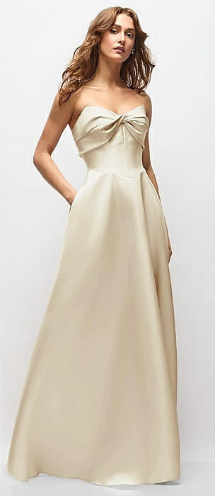 Strapless Twist Cuff Neck Satin Maxi Dress with Basque-Waist & Full Skirt in champagne