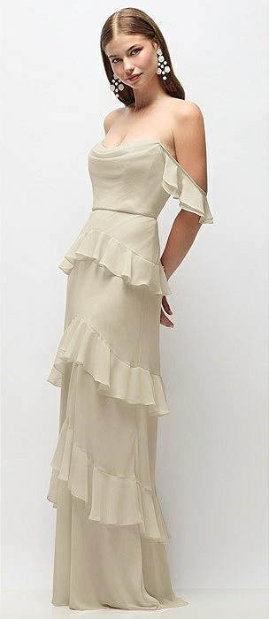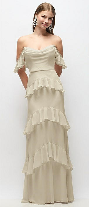 Off-the-Shoulder Cowl Chiffon Tiered Ruffle Maxi Dress with Convertible Ruffle Straps in champagne