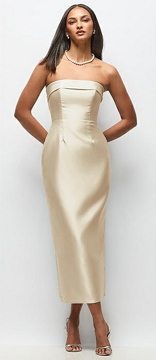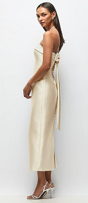 Strapless Cuff Satin Midi Dress with Column Skirt & Back Bow in champagne