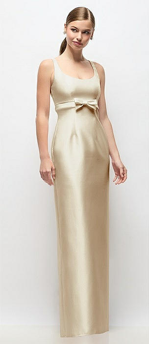 Scoop Neck Satin Column Maxi Dress with Bow at Empire Waist in champagne