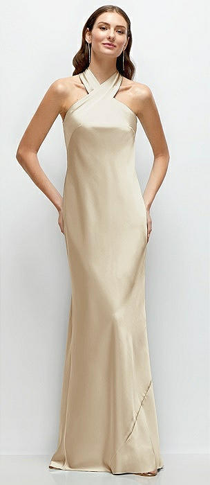 Cowl Halter Open-Back Satin Maxi Dress in champagne