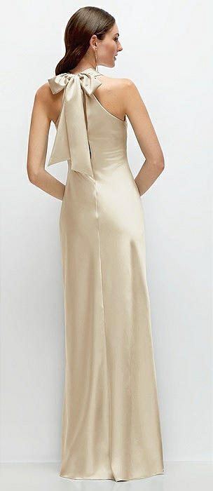 Pleated Halter Bias Satin Maxi Dress with Self-Tie Bow Back in champagne