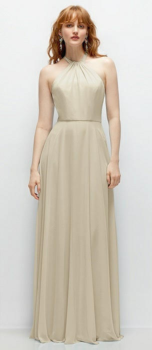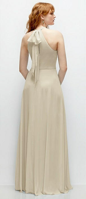 Shirred Halter Chiffon Maxi Dress with Back Sash-Tie Closure in champagne