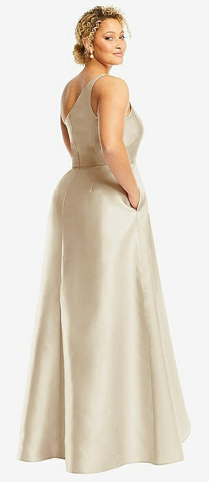 One-Shoulder Satin Gown with Draped Front Slit and Pockets in champagne