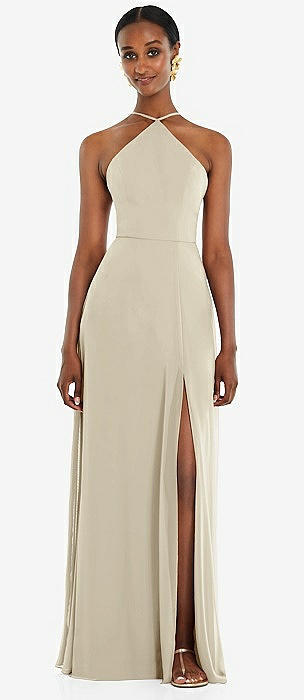 Stand Collar Halter Maxi Dress with Criss Cross Open-Back in champagne