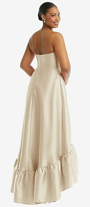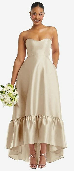 Strapless Deep Ruffle Hem Satin High Low Dress with Pockets in champagne