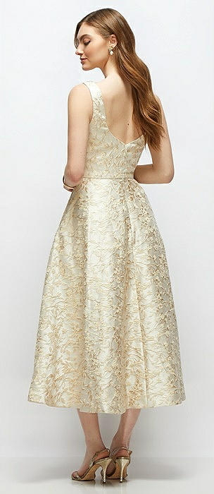 Square Neck Champagne Floral Brocade Midi Dress in champagne filigree
