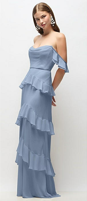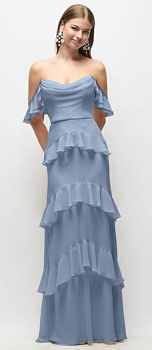 Off-the-Shoulder Cowl Chiffon Tiered Ruffle Maxi Dress with Convertible Ruffle Straps in cloudy