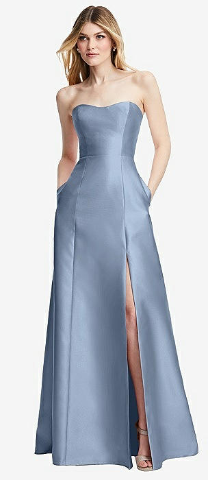 Strapless Satin Gown with Draped Front Slit and Pockets in cloudy
