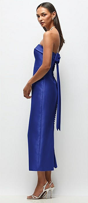 Strapless Cuff Satin Midi Dress with Column Skirt & Back Bow in cobalt blue