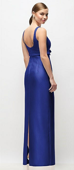 Scoop Neck Satin Column Maxi Dress with Bow at Empire Waist in cobalt blue