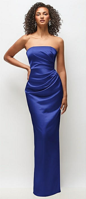 Strapless Draped Bodice Stretch Satin Column Maxi Dress in cobalt blue