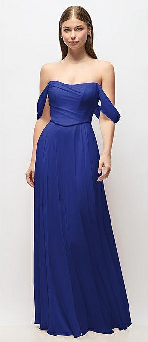 Off-the-Shoulder Basque Corset Chiffon Maxi Dress in cobalt blue